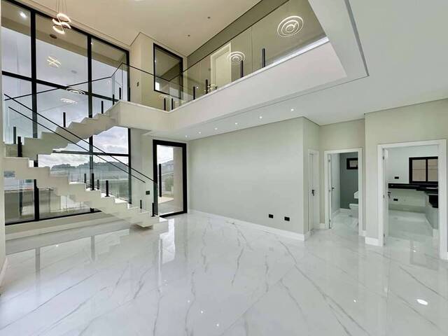 - Escada de acesso ao piso superior com guarda-corpo em vidro.